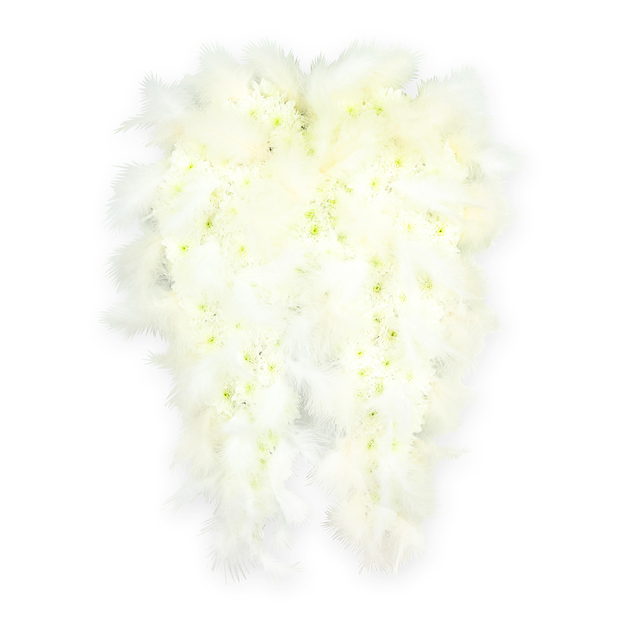 Show your deepest sympathies with our exquisite floral arrangement. Featuring fresh white chrysanthemums intertwined with graceful white feathers, this bouquet embodies purity and peace, making it a perfect tribute.